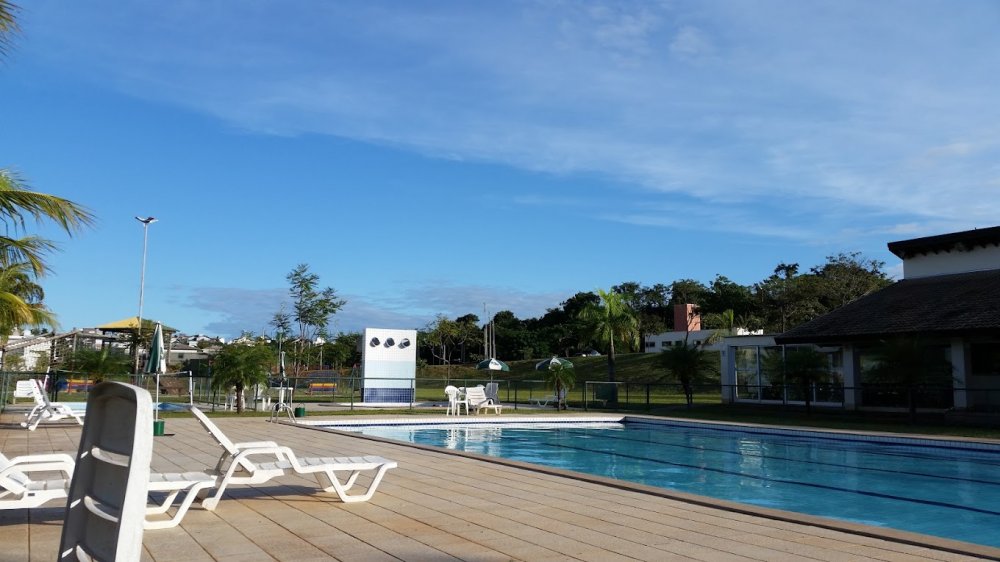 Area do condomínio, lago, piscinas, quadras, pista de caminhada e área verde.